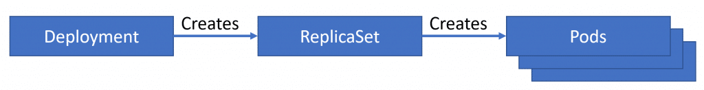 A deployment in Kubernetes is a cluster managed resource that will create and manage the containers or pods that your application requires. A deployment will create a ReplicaSet, which will in turn make sure the right amount of pods is always present for your application. If a pod dies, or a host dies and pods running on it dies, the Replicaset will ensure that your deployment will match its desired state and will create new pods on a new host.