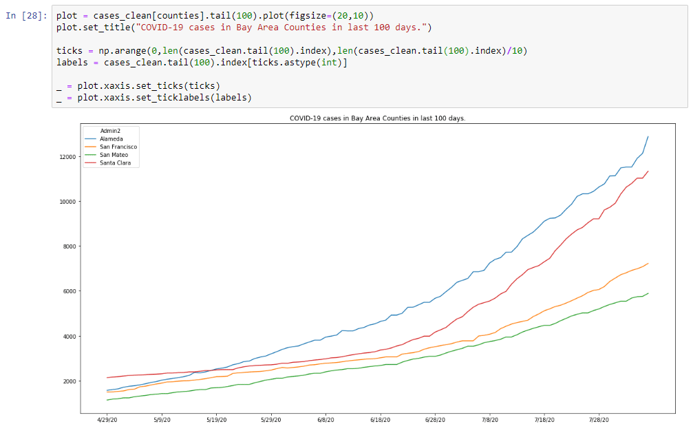 Now that we have a cases dataset, we can plot that dataset. In my case, I’m interested in 4 counties, so we’ll filter by those four counties: